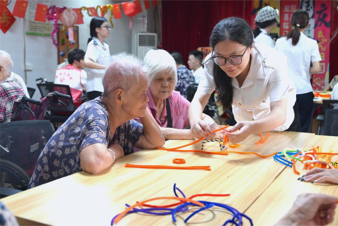 活动现场气氛温馨而热烈。同学们分为若干小组,围绕在老人们身边,开启了充满创意与欢笑的互动环节。在第一个手工创作“扭扭棒制作老花镜”中,同学们耐心协助,老人们兴致盎然,五彩的扭扭棒在指尖缠绕、折叠,一副副独一无二、充满童趣的“老花镜”制作完成。老人们戴上自己亲手制作的眼镜,脸上洋溢着满足与开心的笑容,仿佛重回青春岁月。