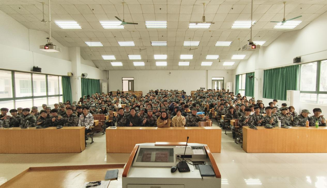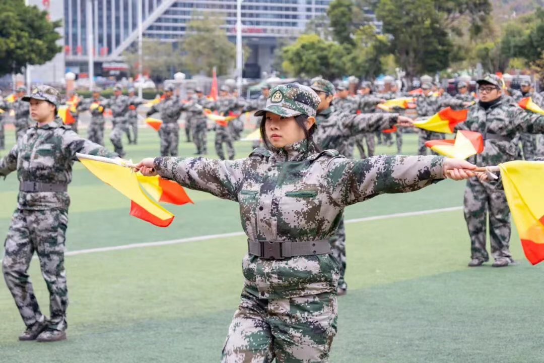 会议第二阶段,全体师生共同观看军训汇报展演视频。视频中,国际交流学院学生组成的旗语方队动作整齐划一,信号传递精准流畅,展现了独特的训练成果与昂扬风貌,引得现场掌声阵阵。